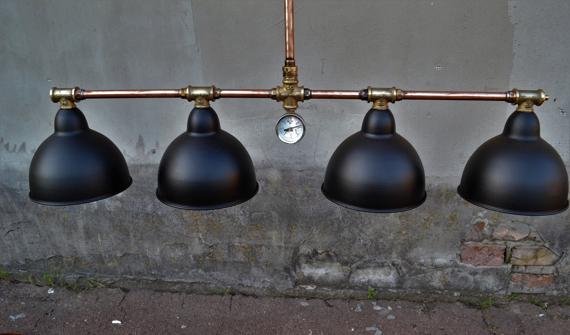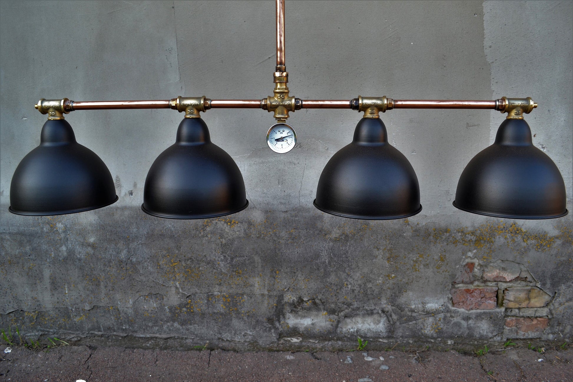 This is a large (40 "wide) steampunk industrial chandelier. With 4 lampshades (lampshade diameter 8 ") will create a truly wonderful atmosphere in your home. Installation pipe height on request.