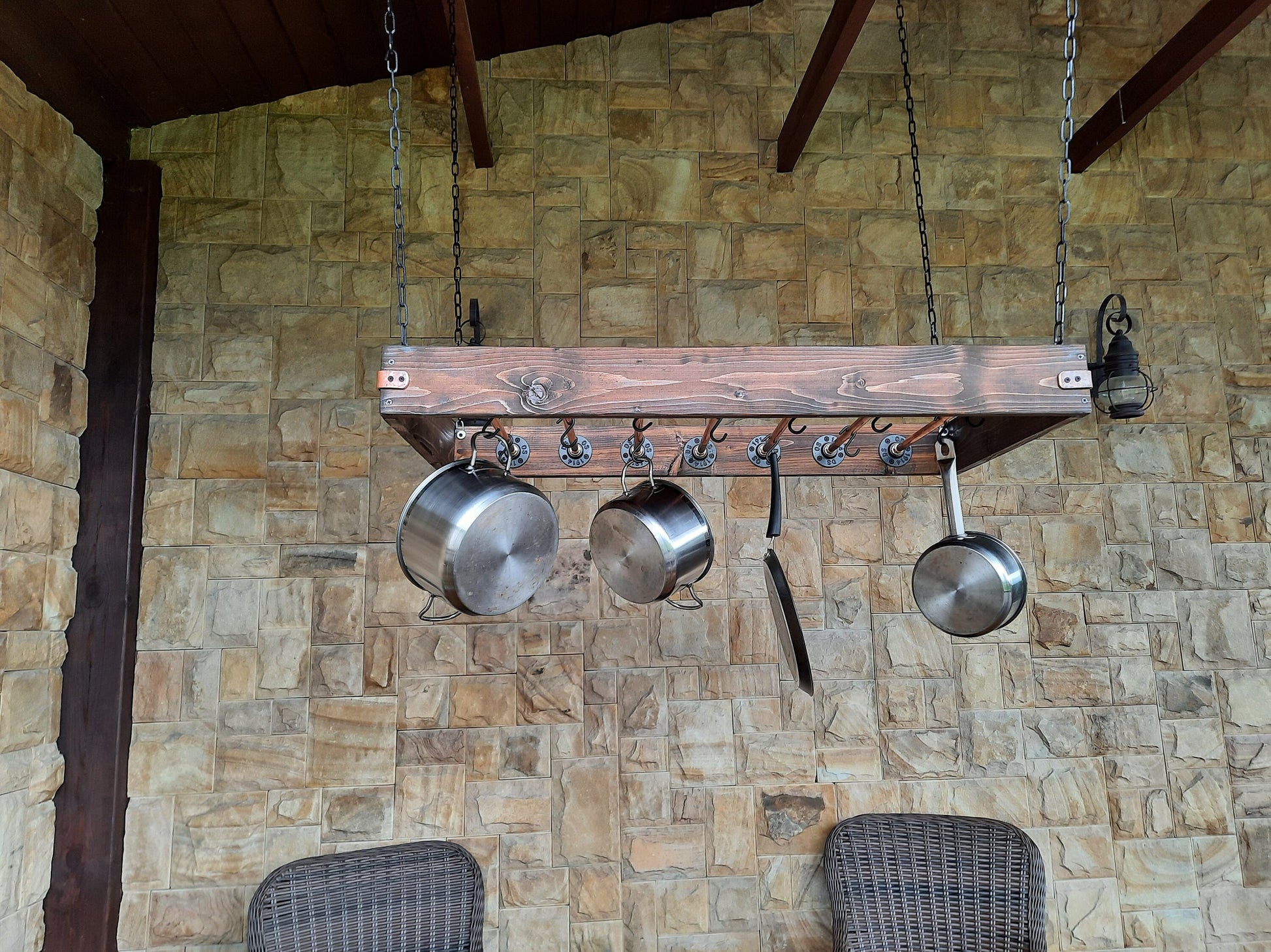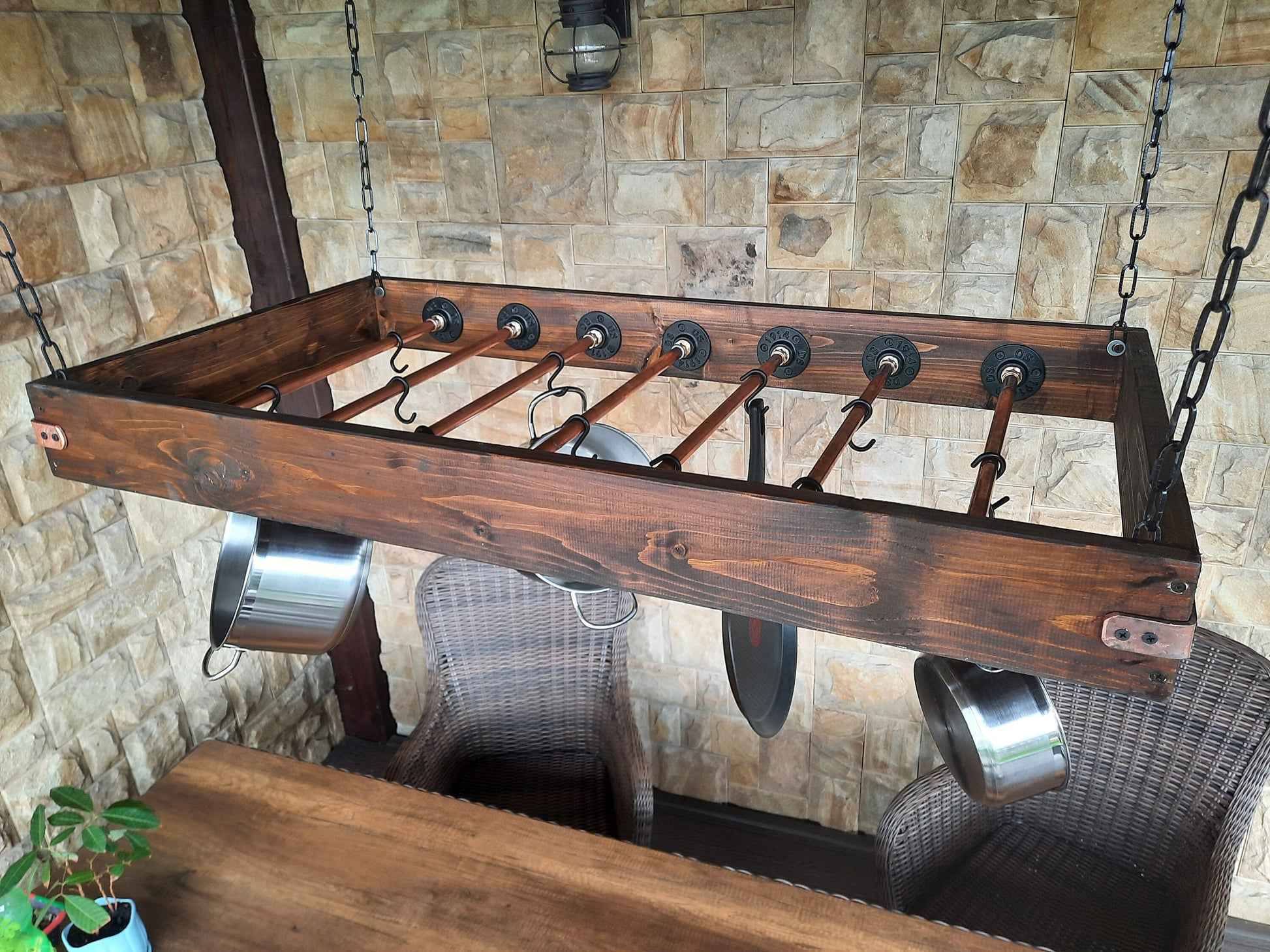 kitchen pot shelf, industrial dish holder, wooden industrial pot, rustic pot, copper storage pot Solid Copper Hanging Pot Rack